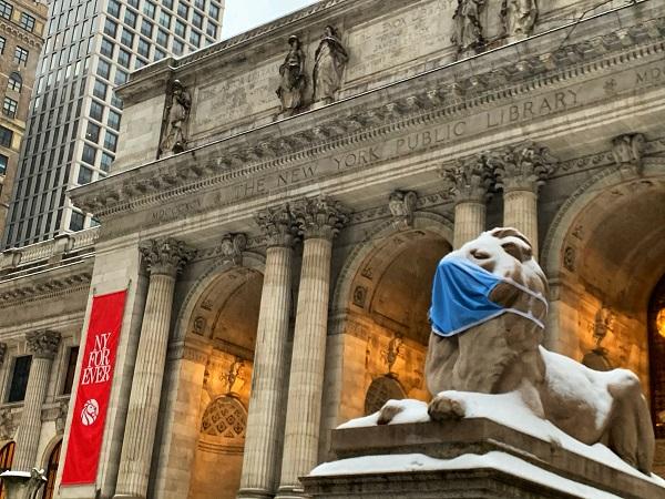 图12:2021年2月19日,位于第五大道42街的纽约市公共图书馆主馆。这座研究型的图书馆自2020年3月14日闭馆至今。北面的石狮子叫“坚毅”,身上落满了积雪,不知道是谁给他戴上了巨型口罩。图书馆门柱红色的旗帜上写着“纽约永在”。