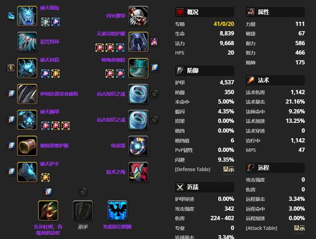 这是元素萨的P4毕业装备,无BUFF属性为1142点法伤、21.16%法术暴击、9.26%法术命中(溢出严重)和13.25%急速,预期最高秒伤为1800点,低于鸟德,高于暗牧。