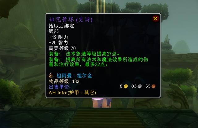 暗牧的第一件装备是项链诅咒骨环,由祖阿曼尾王祖尔金掉落。在祖阿曼会掉落两件法系BIS项链,分别是精神急速项链自然怜悯胸针和智力急速项链诅咒骨环,虽然这两件装备的属性差别不大,但是实际配装使用还是有区别的,自然怜悯胸针是法师、术士、神牧、奶德、奶萨和鸟德的P4毕业装备,而诅咒骨环是暗牧和元素萨的P4毕业装备。