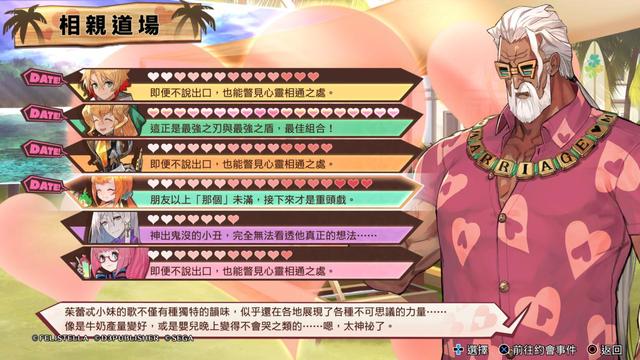 在《魔剑物语》中,“夜间对话”系统被一套听上去非常无厘头的“相亲”系统替代,但它的作用却没有发生太大变化,故事的结局依旧会因为角色间的好感度发生改变。从好的意义上来说,“相亲”弥补了过去“夜间对话”只能选择一人的遗憾,只要在战斗中攒足了好感度,玩家就可以和喜欢的角色展开所谓的“约会事件”,但从坏的意义上来说,这些在约会事件和故事的主线关系极度薄弱,为了突出这些角色在约会中的个性,魔王的存在感也被很大程度削弱,再加上约会事件的数量本身也不怎么丰富,让人很难从其中看到什么乐趣。