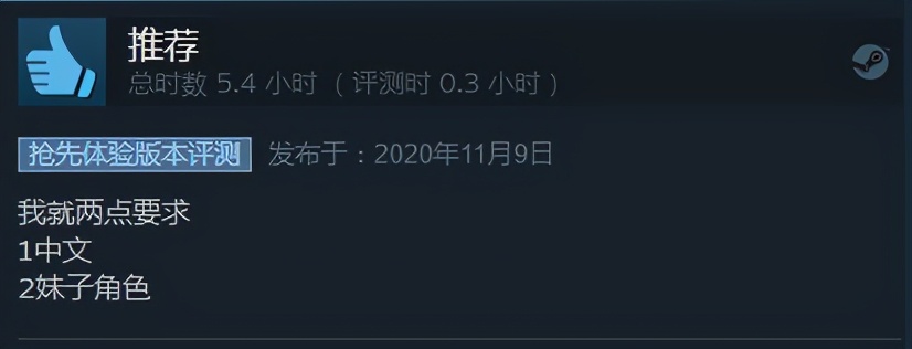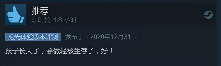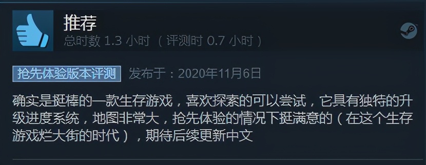 “确实是挺棒的一款生存游戏,喜欢探索的可以尝试,它具有独特的升级进度系统,地图非常大,抢先体验的情况下挺满意的(在这个生存游戏烂大街的时代),期待后续更新中文”
