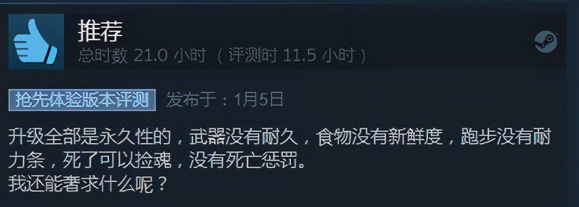 “升级全部是永久性的,武器没有耐久,食物没有新鲜度,跑步没有耐力条,死了可以捡魂,没有死亡惩罚。我还能奢求什么呢?”