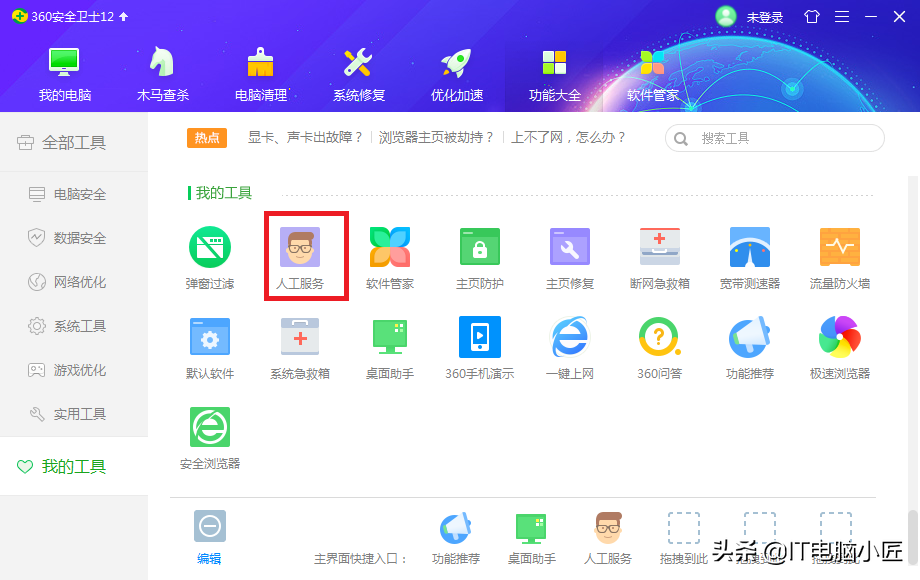 第一步:在360功能大全中选择人工服务