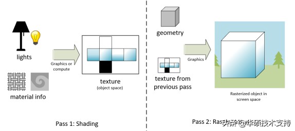 采样器反馈还包含了一项新技术——纹理空间着色。它可以在不栅格化对象的情况下进行对象着色,其中心目的就是缓存和重用着色结果,以减少GPU的计算量。