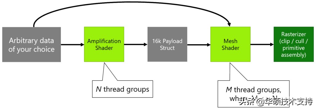 与网格着色器一同出现的还有一个可选的放大着色器(Amplification Shader)阶段,它运行在网格着色器之前,计算得到需要多少个网格着色器,然后并启动他们。