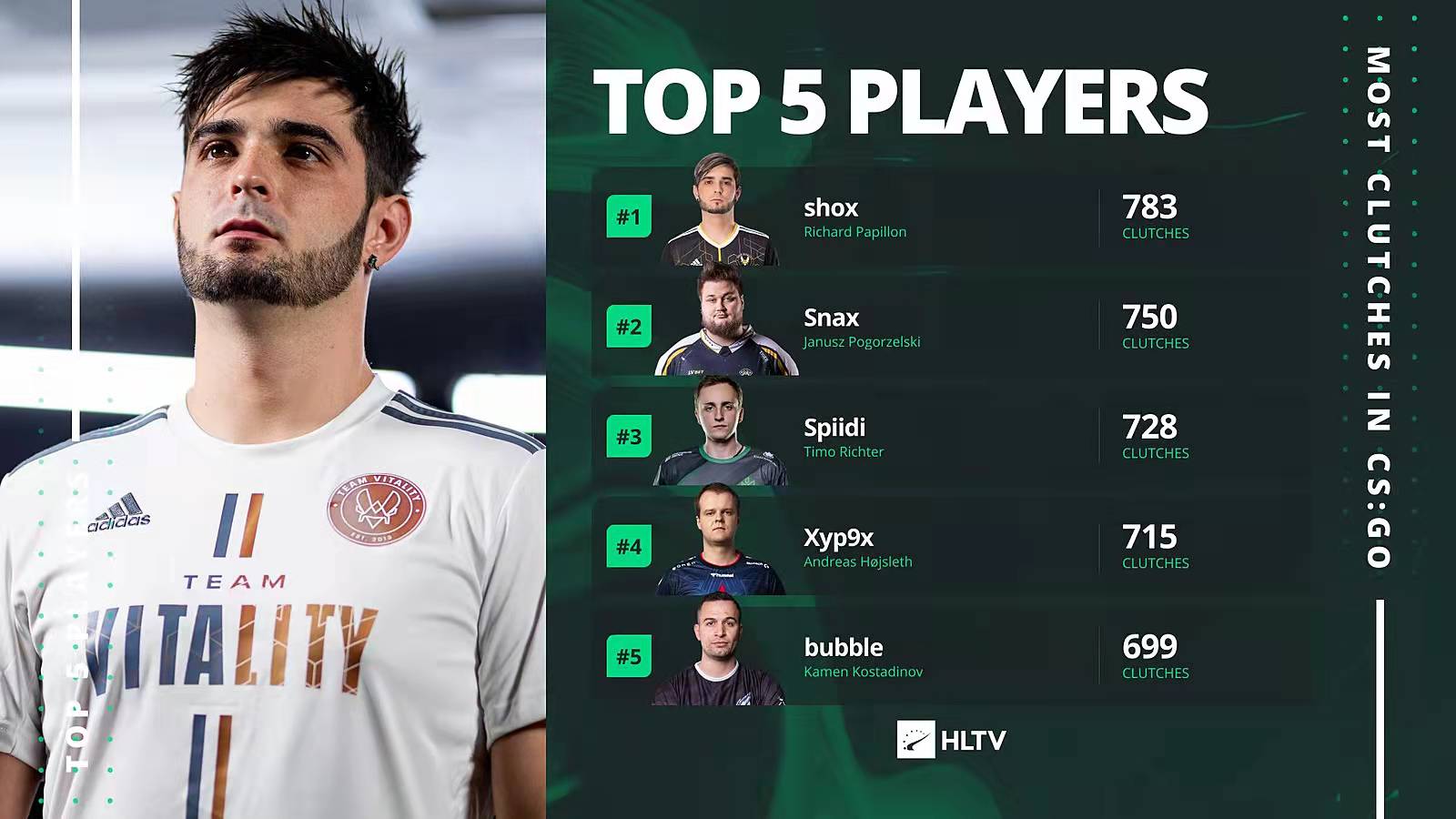 HLTV分享了历史上拿下残局最多的选手TOP5榜单,shox位列第一,他在整个职业生涯中拿下了783个残局的胜利,而丹麦残局之王Xyp9x则以715个残局位列第4。shox能否继续刷新他的记录,保持残局之王的宝座,让我们拭目以待。