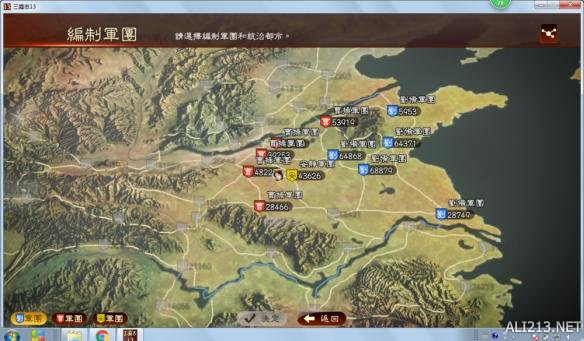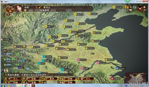 选完剧本要先看看天下形势(这也算一大游戏性),这代城池和人同等重要,地图简单说有四个地区,1河北为代表的中原地区,兵精粮足,城池接近,泡妹搞基天数少,兵力支援令人发指,最好的地方,3(就那么任性),西北西南东南边陲,打酱油的地方不是玩家最终免不了被灭,2,荆北地区新野襄阳益州什么的连在一块也算个小宝地,这是大势