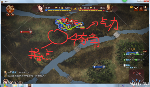 打仗前要先开会,这是开会画面。敌人兵力只有11800,队伍数也不多,敌人应该在本阵。兵力对比差别不大,援军方面,敌关羽很快就到(快速偷本不可能)----我的援军后面到-----在后面还有张飞的(打完了估计也过不来,要快)。那么,布阵满足以下条件,挑近点的路,能够打尽量多的敌人据点(这里只有3号,1号不顺路,尽快消耗敌人兵力,但又不能被敌人偷本,就进4号据点了