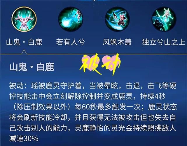 瑶受到控制效果时,会立即进入鹿灵形态,期间处于无敌状态,同时自己也无法攻击别人,可以理解为无敌+净化,效果维持4秒,CD为60秒。