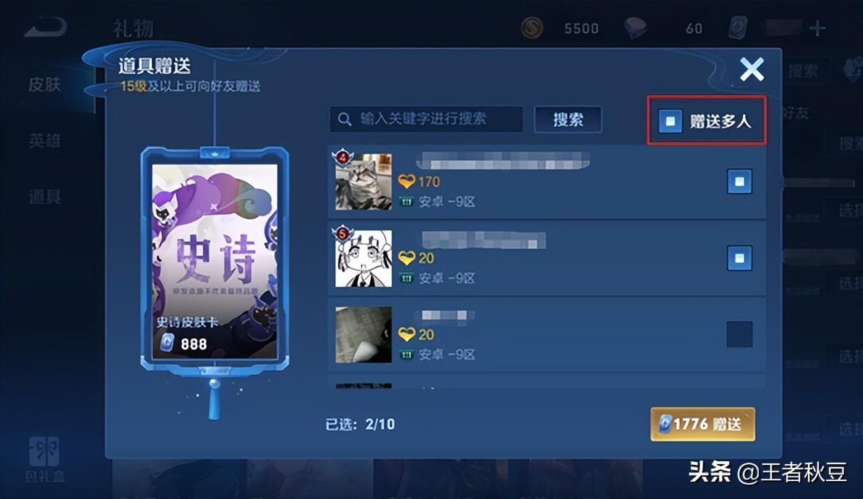 如果之前想要送皮肤礼物给多人,需要频繁操作。新增一礼多送功能,可以同时赠与多人皮肤/星元/英雄,可以做到雨露均沾。另外如果赠送的人已有相应礼物的话,还会提醒已有,避免重复赠送。最多可以一次性赠送10个玩家。