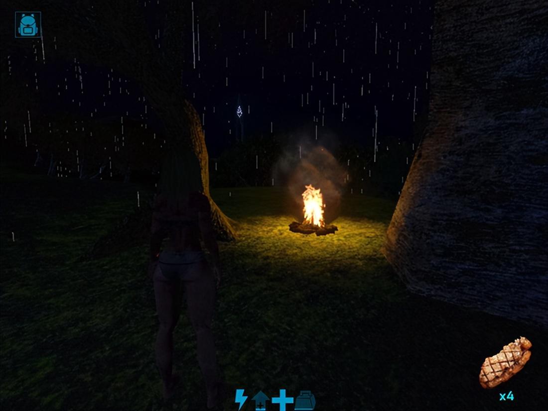 其中,复杂多变的天气系统与昼夜系统取得了圆满呈现,下雨、晴天、夜晚、白昼都会有不同的buff与视野。在晚上冰冷debuff会不时降低玩家的安康值,假定没有篝火是难以渡过第一个晚上的,这也使得新手教程的第一个任务就是让玩家去做篝火。这种拟错误想除了设计上的布置,更多的同样依托着引擎的加成。