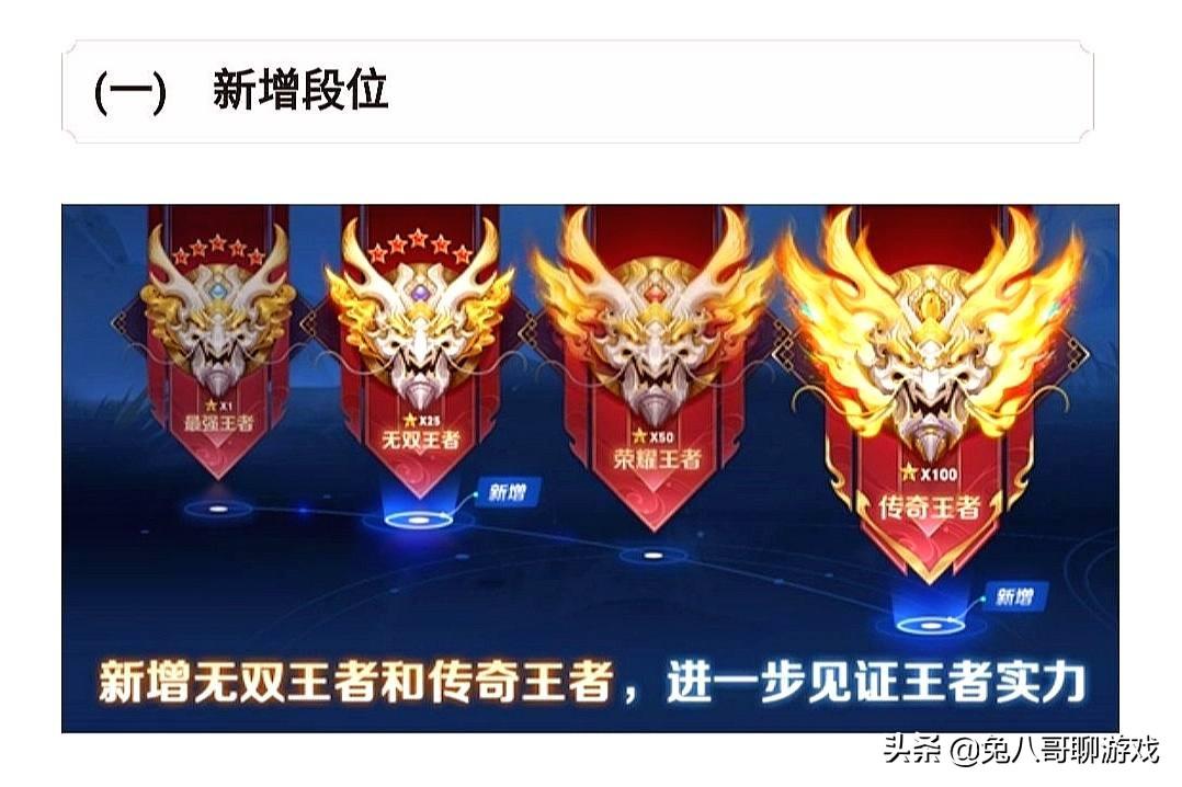 在S26赛季,王者之上段位,将会有两个新增段位,也拥有单独的称号,分别是25星~49星的无双王者,以及100星以上的传奇王者。而且这两个称号,将会在自己的主页面进行显示,那么这一点对于很多没有冲段动力的玩家来说,可以不是传奇王者,但必须是无双王者。