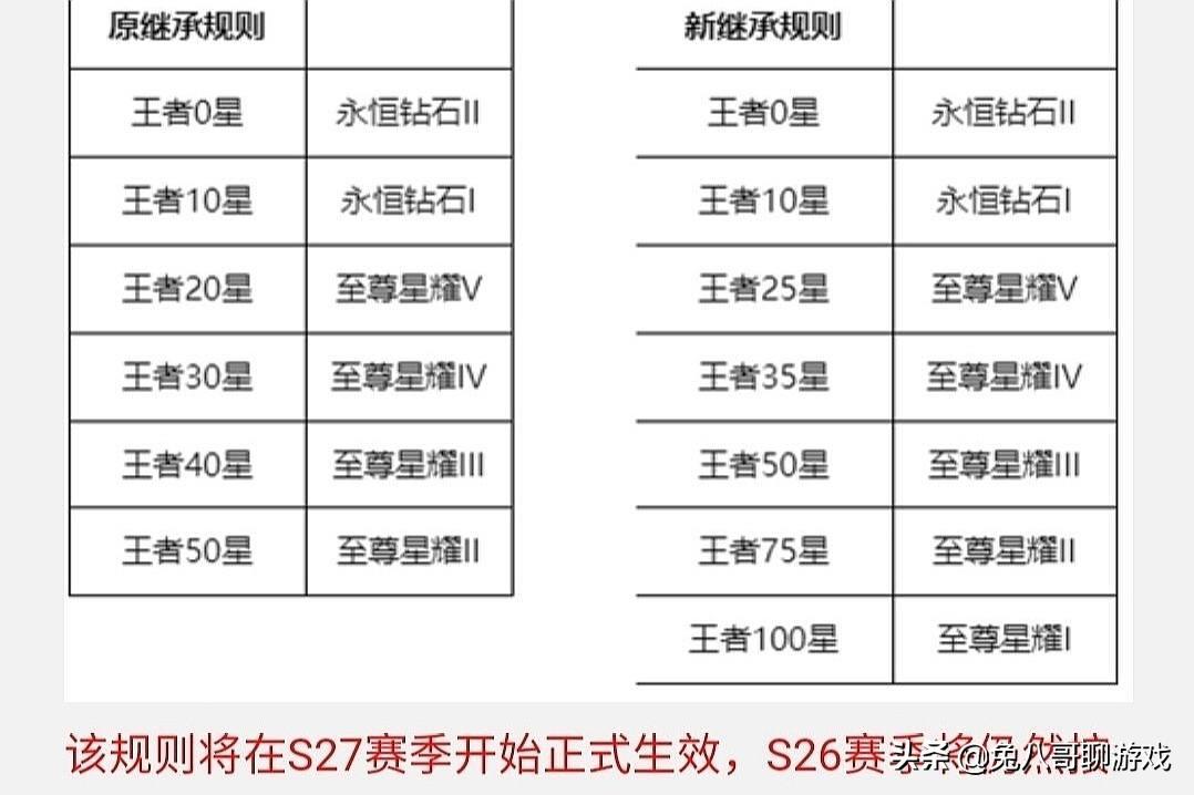 至于新的继承规则,将会在S27赛季开始实施,也就是说,在S26赛季开启之后,大家想要在S27赛季拥有更好的段位继承,那么最低也需要达到王者25星。并且在S26赛季上到荣耀王者的玩家,再也没有机会继承到星耀二了。