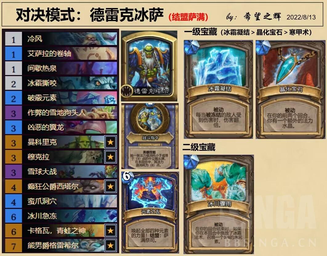 曼科里克,穆克拉,青蛙之神,熊男爵换成冰霜震击更好!!!B站希望之辉大神的冰萨,实测拿到冰翻强度还是很高的,极大克制冰法,有人能告诉我这个图这么做嘛