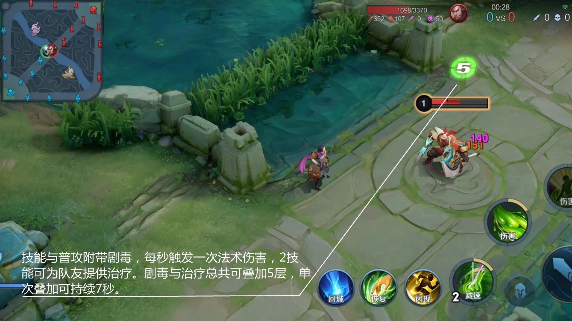 当然如果你的手速够快,那么你还可以尝试一下晋级玩法,普攻接二技能,只要普攻和二技能衔接得好,其实可以同时打出普攻和二技能的,这样会更快的打出三层被动。扁鹊二级是非常强的,满血的c位,只要被你A、1、2挂满五层毒后,基本上只能剩下1/3的血量了,所以如果遇到血量不健康的C位,想办法挂上五层毒基本上人头收入囊中。