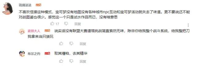 当然,也有网友认为“不喜欢怪猎这种模式,宝可梦没有地图没有各种城市NPC互动和宝可梦活动就失去了味道。”是一种“取其糟粕,去其精华”的操作。