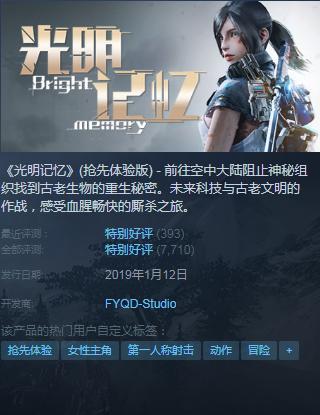 《光明记忆》(英文名:BRIGHT MEMORY)是由国内的飞燕群岛个人工作室(FYQD-STUDIO)制作开发的一款第一人称射击游戏,本作曾于2016年发行了IOS版试玩,并在2019年1月12日又登陆了PC的STEAM平台发行抢先体验版,售价29元。自登录SETAM平台至今已有5个月,测试版凭借着优秀的操作手感与良好的射击体验,目前玩家口碑早已爆棚,在STEAM所有购买本作抢先体验版的用户评价中,特别好评率达到了93%,而在今年2019年的E3展会上,本作同样公布放出了《光明记忆:无限》的首支战斗演示预告片!并宣称《光明记忆:无限》仍在初期开发阶段,预计登录XBOXONE/PLAYSTATION平台,PC版支持RTX光线追踪。(已经购买STEAM抢先体验版的用户即可享受免费升级此作资格)