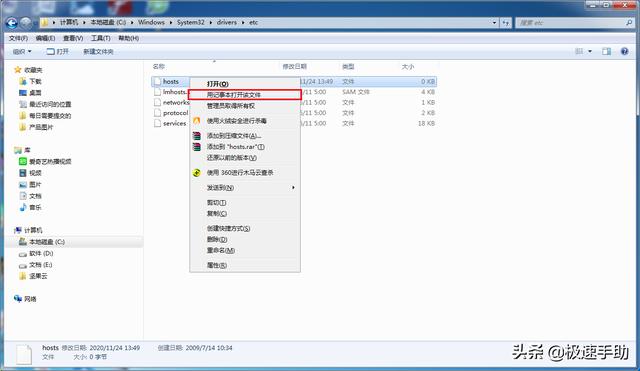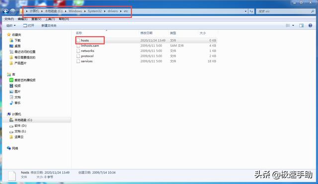 第五步,接着我们打开电脑的系统盘,然后定位到电脑的【C:\Windows\System32\drivers\etc】文件夹当中,然后在文件夹当中我们找到hosts文件。
