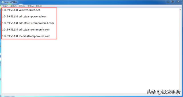 第七步,最后我们在hosts文件的结尾处,输入一下内容,这里的ip地址就是刚刚上面我们ping通的ip地址,最后我们点击进行保存。