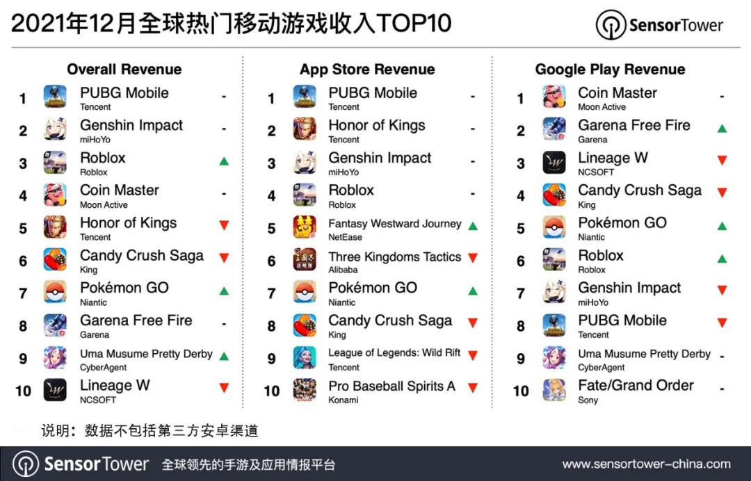 榜单前五另外三款游戏为《Roblox》、Moon Active《Coin Master》和腾讯《王者荣耀》。