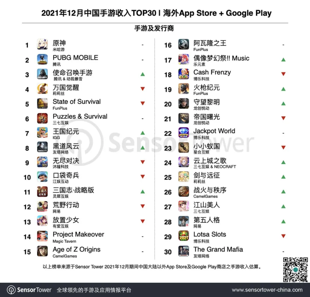 自2020年底上市以来,三七互娱《Puzzles & Survival》收入稳步增长,在日服周年庆和圣诞活动的带动下,于12月24日创下日流水新高。本期该游戏收入环比增长10%,稳居榜单第6名。
