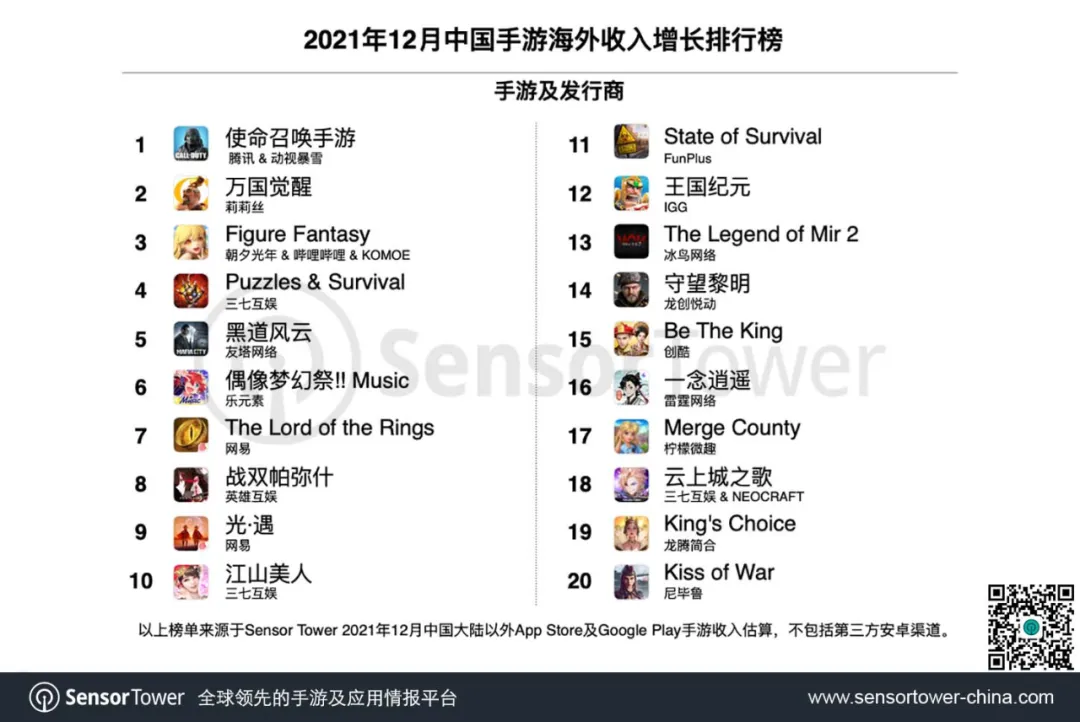 网易旗下SLG新游《The Lord of the Rings: War》12月收入环比增长49%,位列增长榜第7名,出海手游收入榜第33名。凭借《指环王》IP的强大号召力,以及网易手游的研发实力,该游戏正成为又一款享誉海外的IP改编手游大作。