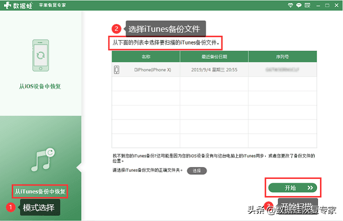 步骤一:打开数据蛙苹果恢复专家,选择“从iTunes备份中恢复”,若您的iTunes备份文件在此电脑上,则会自动匹配到文件,选择要扫描的文件后,点击“开始”。