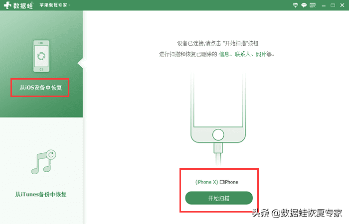 步骤一:在电脑上安装数据蛙苹果恢复专家后,选择“从ios设备中恢复”这个模式,接着把手机连接到电脑后,点击“开始扫描”。