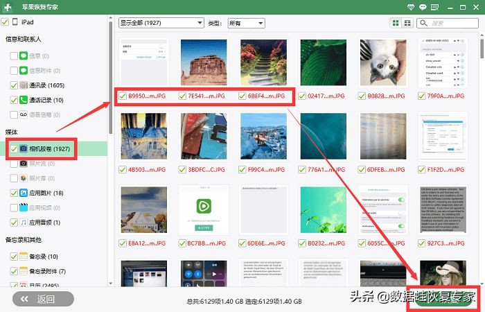 步骤二:扫描完后,在左侧的信息栏中,找到“相机胶卷”,点击进去,选取需要恢复的照片,选完后,点击右下角的“恢复”。