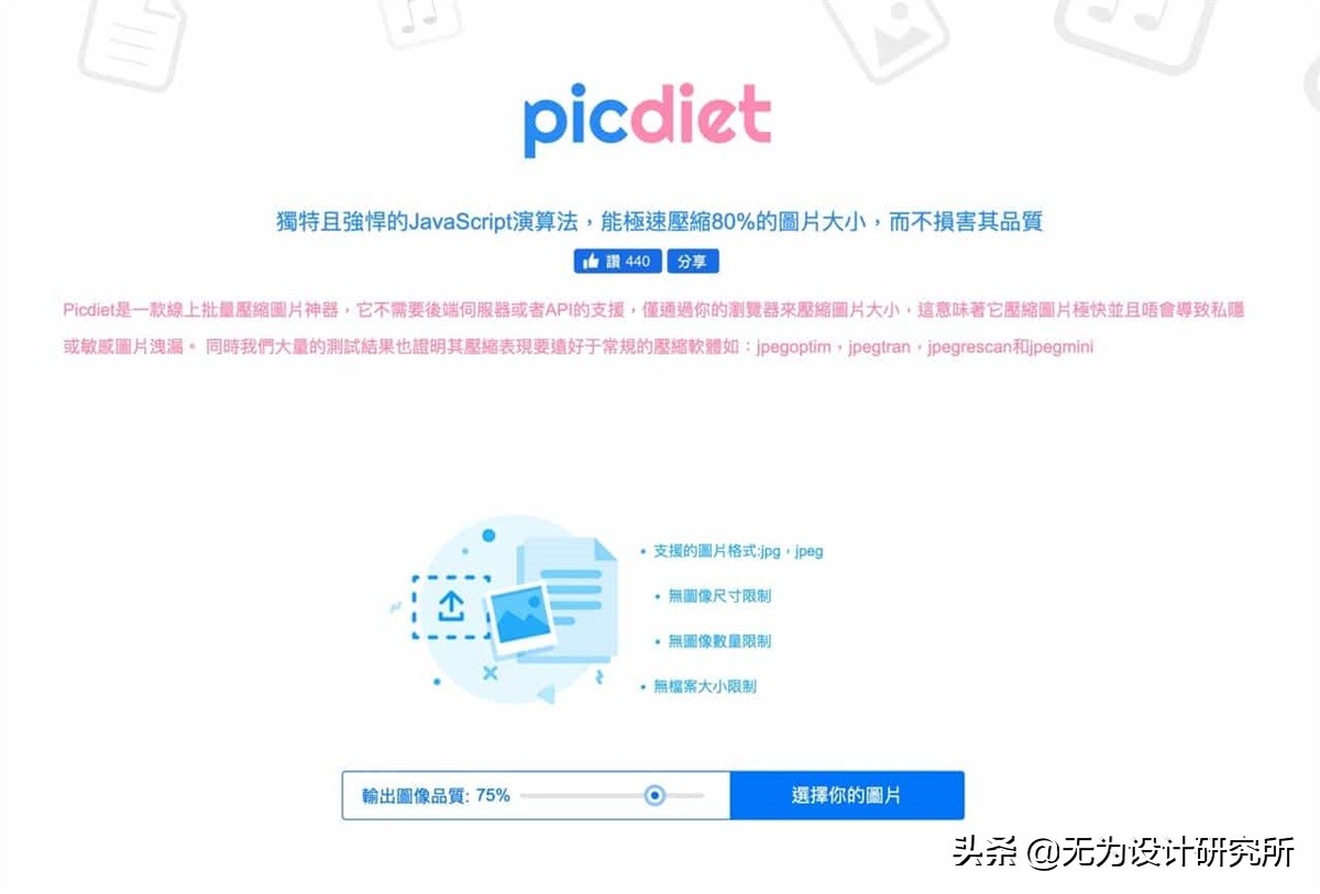 Picdiet 透过独特的 JavaScript 算法快速压缩 80% 图片大小,而且能够无损图片画质,Picdiet 号称不用任何后端服务器或 API,仅透过浏览器压缩图片,这代表压缩速度快,不会导致隐私或敏感图片外泄,在压缩效果方面也比现有的压缩软件更为理想。