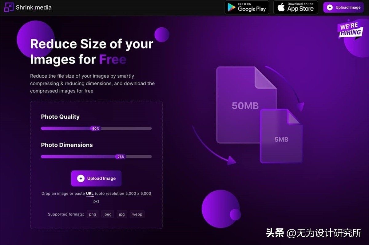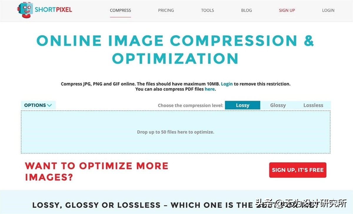 Compressor.io 能在在线把图文件压缩,直接让你比对源文件跟压缩后的图片间有无任何差异,支援 JPG、PNG、GIF、SVG、WebP 五种常见格式,单个文件最大支持 10 MB,提供无失真和失真(降低质量)两种压缩技术,也能依照需求自行调整相关设定。