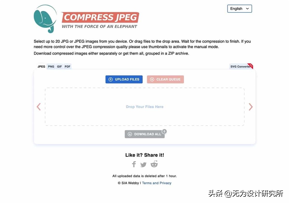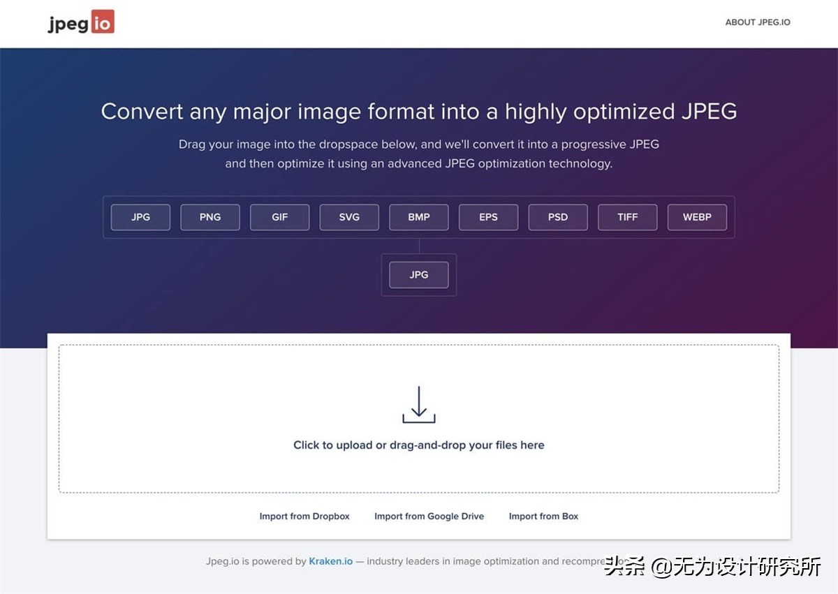 Jpeg.io 是知名网页优化、整合图片压缩服务 Kraken.io 推出的在线图片转文件压缩服务,支持多种常见常用图片格式,只要将图片拖曳到网站里,即可快速转换为优化的 JPEG 图片。虽然 Jpeg.io 网站里没有说明何为优化的图片,但应该是图片尺寸更小、分辨率和画质不变的无损压缩,支持以云端硬盘汇入大量文件,进行批处理。
