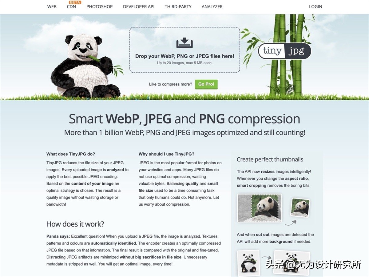 TinyJPG 和 TinyPNG 来自同一个开发商,早期 TinyPNG 只支持 PNG 格式,后来加入 TinyJPG 网站让 JPEG 图片也能使用压缩功能,不过现在两者已经整合在一起了,无论是打开哪一个网站都能正常压缩 WebP、PNG 和 JPEG 三种常见、常用的图片格式,在不破坏原有图文件画质的情况下,可以减少超过 70% 的大小。