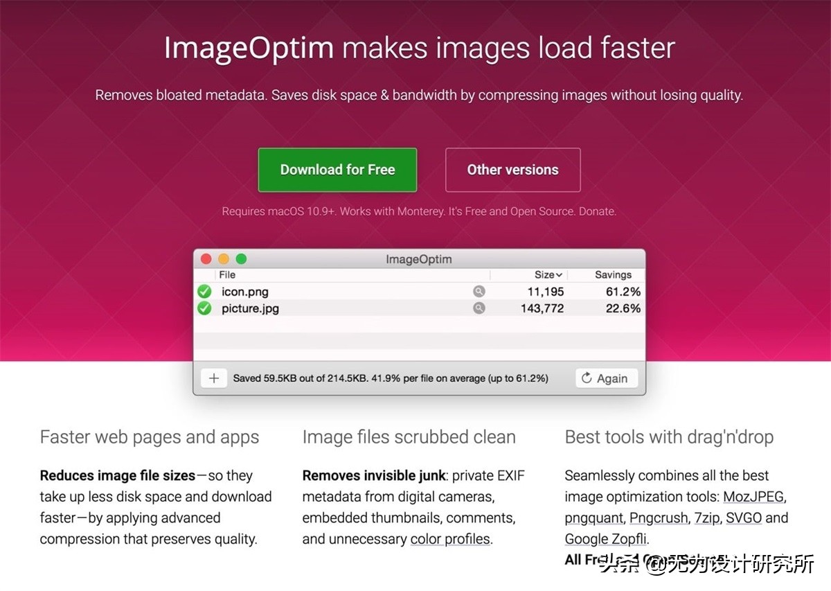 ImageOptim 是一款很轻巧、简单易用、开放原始码的相片压缩、优化工具,只要把图片拖放到 ImageOptim 就会进行自动化处理,支持 PNG、JPEG 和 GIF 三种常见的图片格式,背后使用多种图片处理技术。