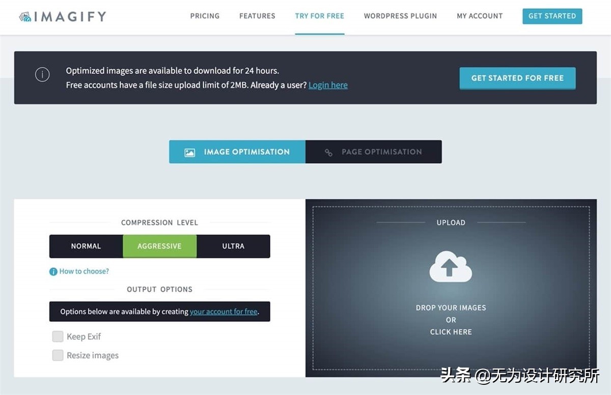 Imagify 和知名的 WordPress 快取外挂「WP Rocket」来自相同开发团队,严格来说它并不是一款免费服务,Imagify 是一个 WordPress 插件,可在用户上传图片时,利用远程服务器来进行图片压缩优化,是你想获得更小尺寸图片又不损失画质的好选择。顺带一提,它也有提供免费的在线压缩工具,不过有单个文件最大 2 MB 限制,而且压缩后的图片只会保存 24 小时。