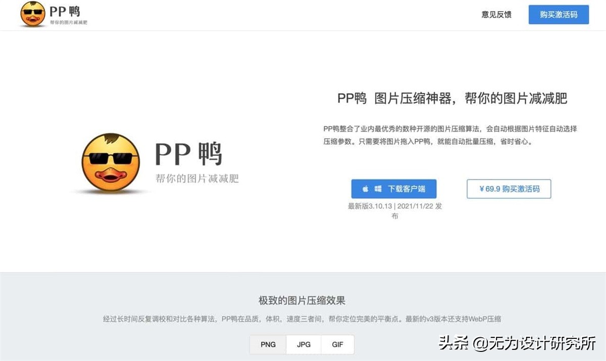 PP鸭图片压缩工具,支持 JPG、PNG 和 GIF 三种常见格式,利用该软件的算法,自动完成图片压缩任务,且在保证图片质量下有效降低图片大小。这个软件适用于 Windows 及 Mac OSX 两大平台,免费版会有使用限制,付费购买注册码可解除限制。
