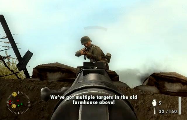 但比较可惜的是,本作在这些方面的表现并不能让人感到满意,先抛开发售年份不说,游戏本体的人物与背景、建筑物表面单薄且无质感的贴图,很多时候甚至使玩家都无法区别远处的敌人和周围背景(全都模糊一片了);不足的帧数带给玩家的是更加强烈的眩晕感觉;而在游戏能够见到的特效可以说是寥寥无几,甚至火焰的表现都十分得少,更别说烟雾了。最无奈的就是敌人只要被击毙就会瞬间在眼前消失,这大大地降低了游戏的真实感。而反观自己的队友,虽然直在玩家周围拼命地叫嚷和射击,但就是打不死敌人,当然,自己也不死......这样的设定真是让人哭笑不得。当然,以上绝大部分缺陷还是要归结于机能的问题,如果能够在如今的PS4或者Xbox One上推出,相信游戏的表现会比现在要强上很多。