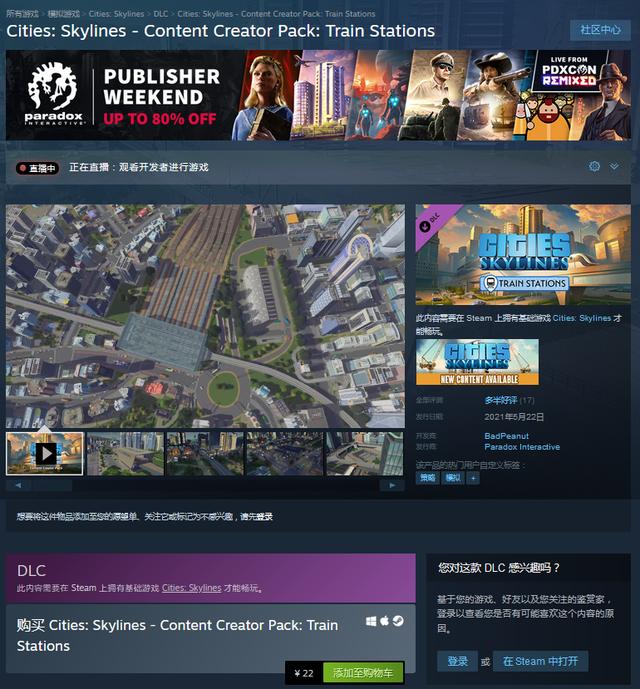 《城市:天际线》新DLC“Train Stations”售价22元,目前已经上市,感兴趣的玩家可以获得Steam商城链接。
