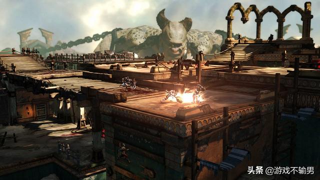 其次制作人在镜头变换上的功力不够。战斗中经常不合理的把视角拉得超远,一个宏大的场景里主角跟蚂蚁似的一小块跟敌人打,都看不清谁是你自己谁是敌人。虽然战神经常要表面人神之战的巨大差距,但显然本作在镜头变换上不尽合理,作为一个固定视角游戏出现这样的情况真的非常不应该。