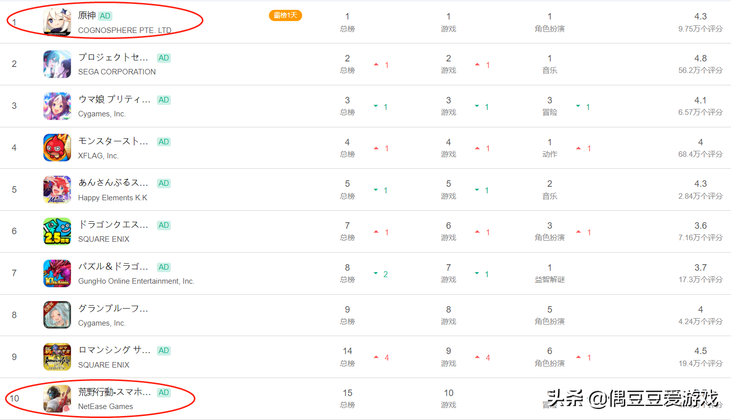 日本畅销榜上,米哈游《原神》排名第1。网易《荒野行动》排名第10。