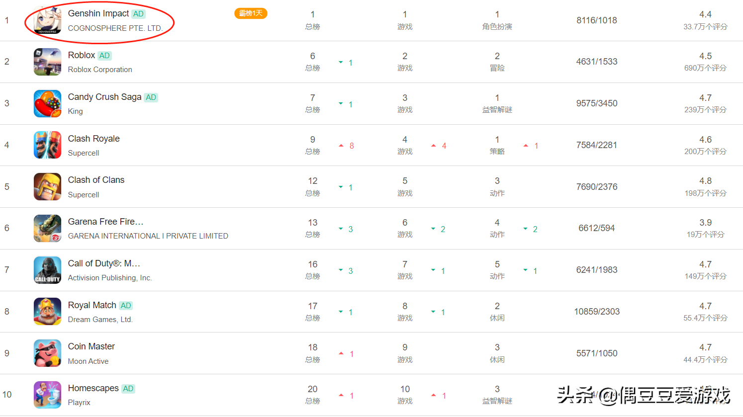 美国畅销榜上,米哈游《原神》排名第1。
