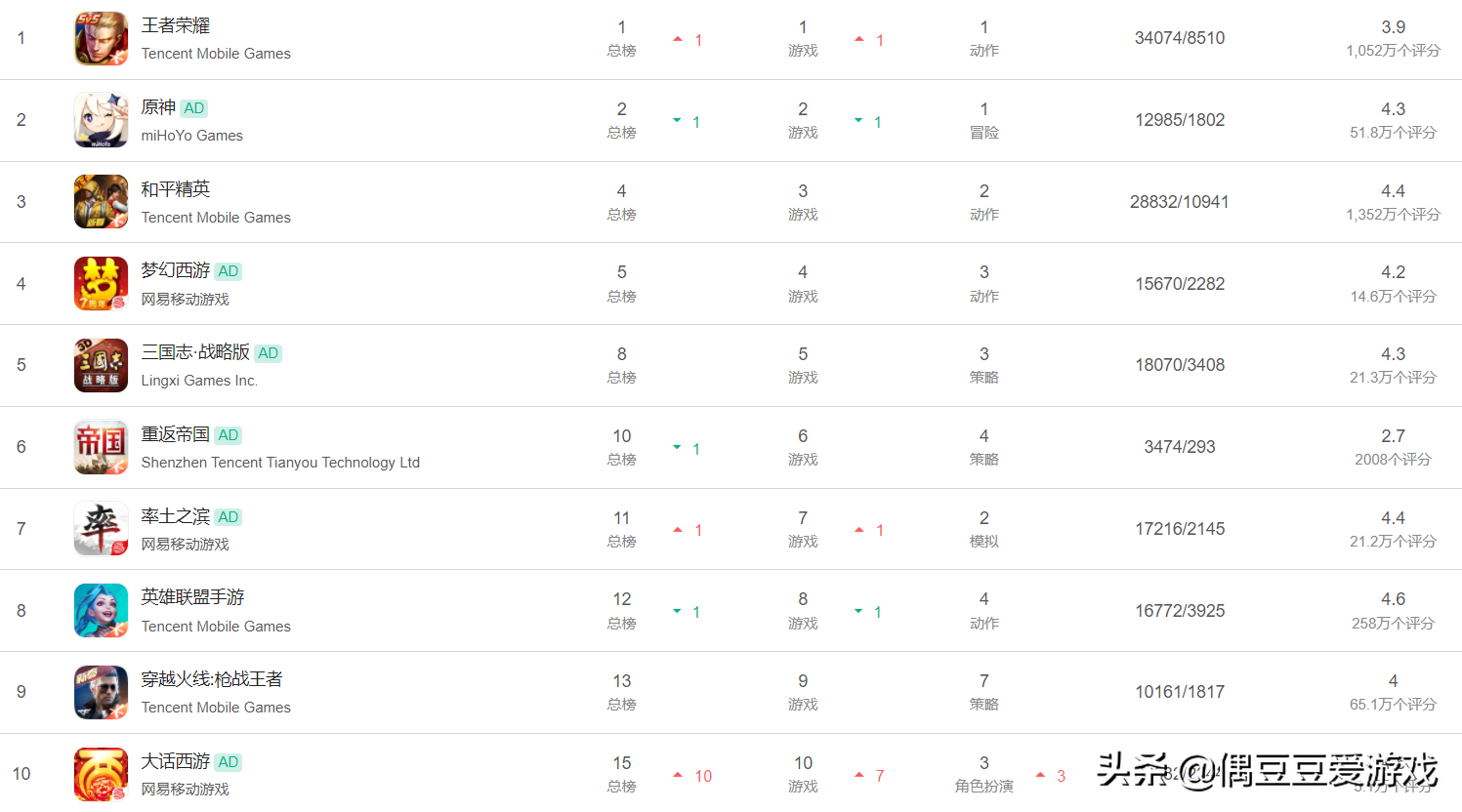 今天前10名腾讯占据5席、网易2席、米哈游、灵犀互娱、雷霆游戏各占1席。