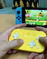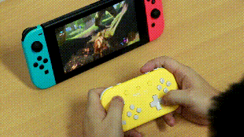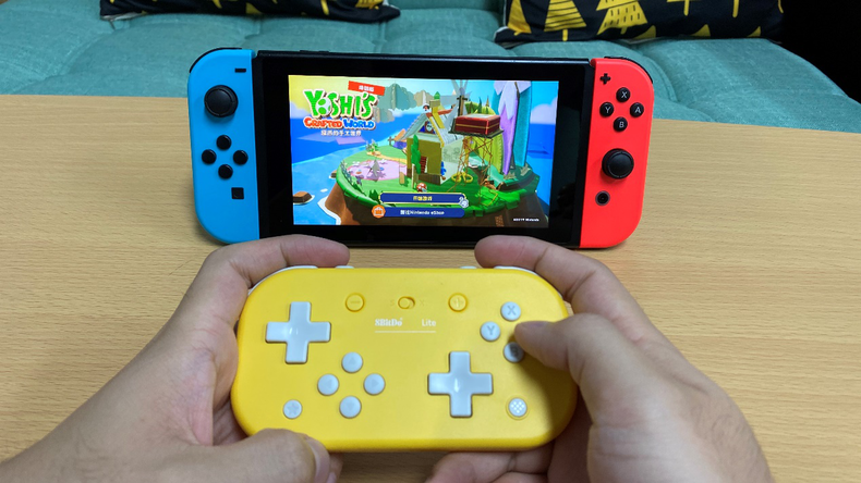将拨杆拨动至“S”模式,选择Switch平台,按照Home键开机,然后按住顶部的配对键,再进入switch系统设置,按照步骤一步一步操作即可连接手柄,连接后迫不及待的开始玩游戏。我们测试的第一个游戏是《耀西的手工世界》,鲜明的画风,可爱的人物造型,都让我在看到这个游戏的时候就产生了好感。