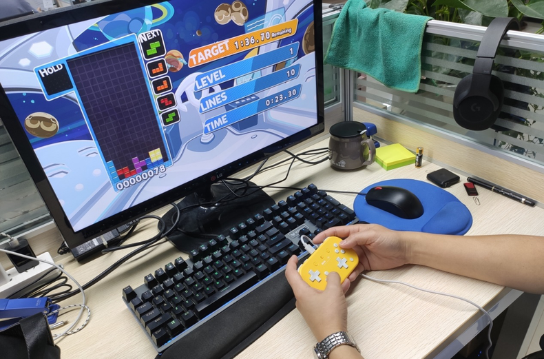 八位堂Lite蓝牙手柄通过USB连接电脑后,不需要什么设置即可使用,这个必须点赞,我这个人最讨厌使用前繁琐的设置。虽然不像格斗类游戏一样是需要连招,但是《俄罗斯方块》更多的是在考验眼睛、大脑和手的协同作业。八位堂Lite蓝牙手柄的键程短、反应速度快,我们用分离式十字按键的左右键移动方块,上下键加速,用A/B键变换方向,用它操作的时候会有一种如臂使指的畅快感,而且分离式十字不会出现因为串键而出现误按的情况,操控更加精准,脑子里想好下一步要怎么放,手上的动作就能跟得上,真正地做到了得心应手。