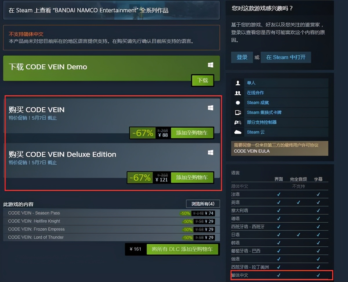 《噬血代码》是由万代南梦宫打造的一款“类魂”ARPG游戏,本作已在Steam商城开启了特惠促销,游戏原价268元,现在折后仅需88元,达到史低。豪华版原价368元,现在折后121元,游戏支持繁体中文。如果你还不确定自己是否喜欢这类游戏,那么该作还有试玩Demo,可以先体验一下。