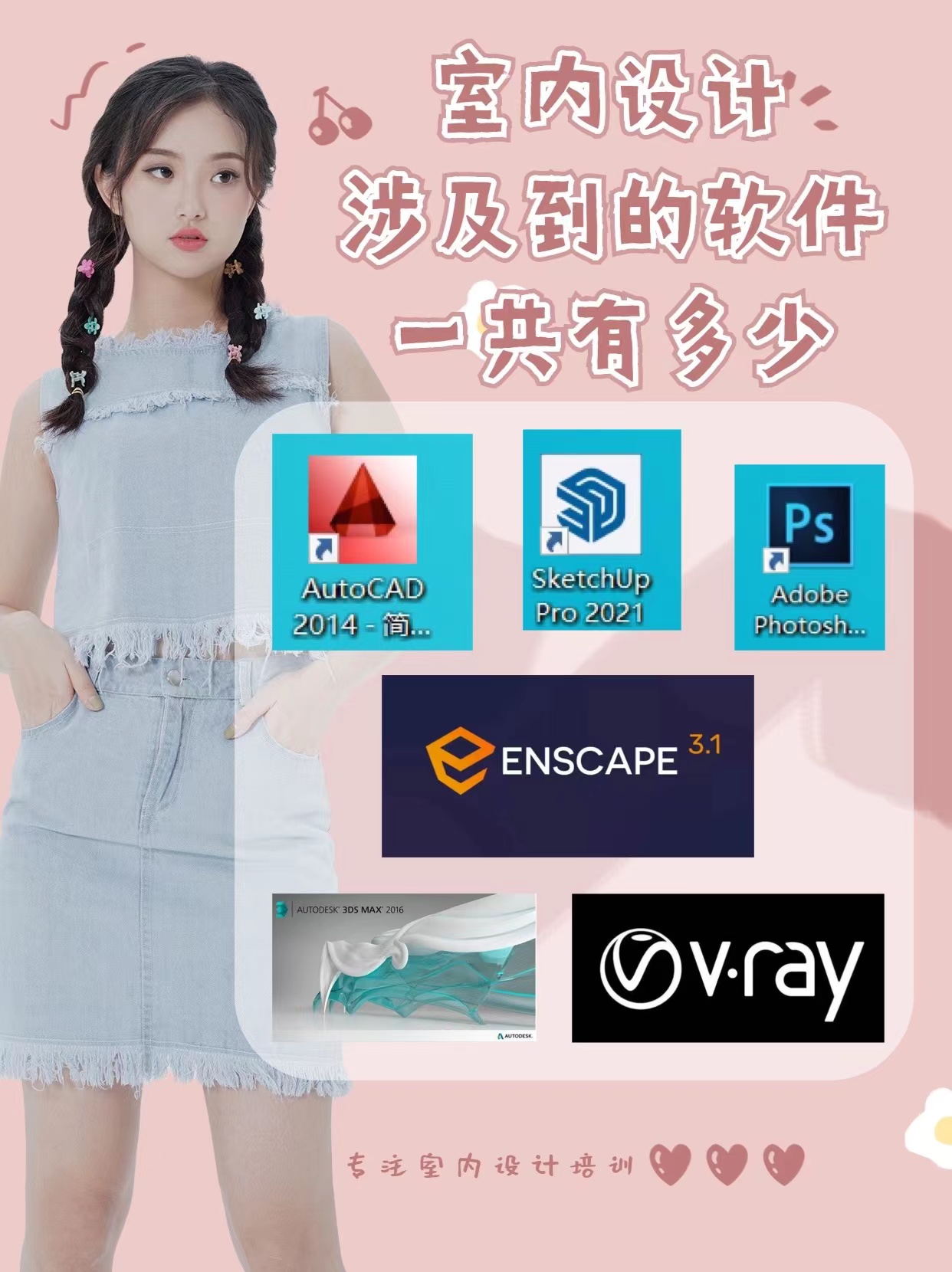 先总结一下,室内设计要用到的常用软件吧,它们分别是CAD、SketchUp、3Ds MAX、Vray、Photoshop、Enscape等,这里有些软件功能是重复的,选择自己适合的就行。