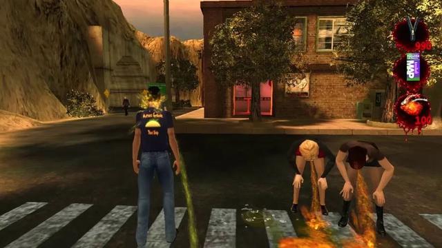 是不是很莫名其妙?因为这就是本作的风格,表面看起来一些正常,但内里却给玩家设置了很多血腥反社会的内容。主角可以开枪在街上随便射杀路人,可以用燃料将路人都点上火,甚至拿刀肢解其他人的身体,脑袋四肢全部砍断。另外主角还可以随意向其他人身上撒尿,之后还会感染淋病。游戏中动物的下场也都不太好,猫、狗、大象都是黑作坊用来制作食物的原材料,而主角甚至可以将活猫当做消音器插在枪管上,每发射一枪猫都会发出惨叫……就算你深知虚拟世界和现实时间完全不同、虚拟世界进行发泄不会影响现实这些道理,但游戏中很多内容确实会引起一部分玩家直觉上的不悦和生理上的不适。