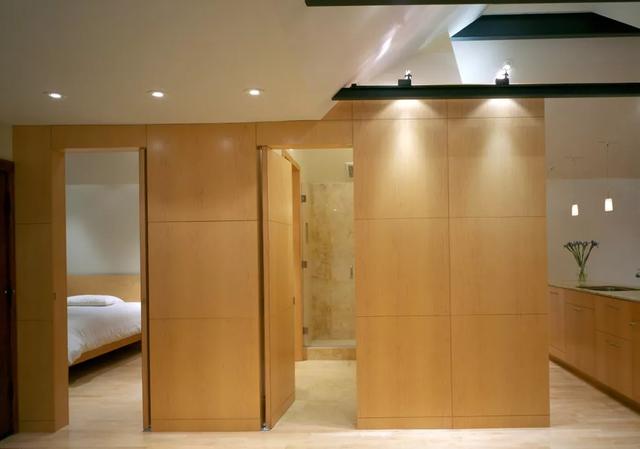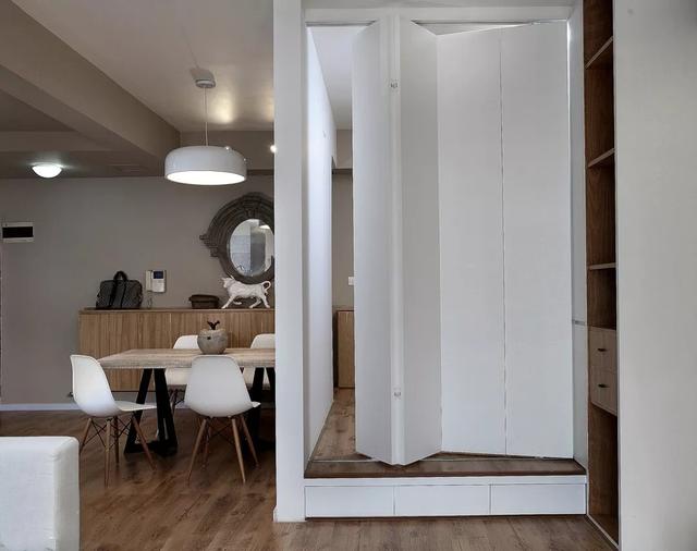 旋转门需要占用的空间多,稍大户型的朋友可以试试。它包含了门和隔断的双重功能,空间整体感更强。