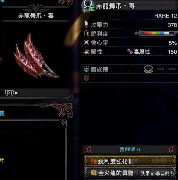 和直接堆匠不一样的是,作为模板的基础冥赤龙武器,是没有紫斩的(出匠5也没有):