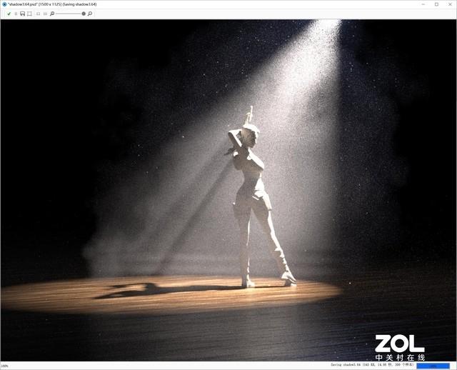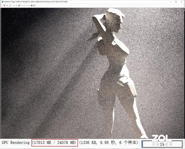 如果上面低分辨率的渲染时间感觉差距不大,上面笔者将素材尺寸调整为7680×5760分辨率,采样率不变再次进行渲染。可以看到这次iGame GeForce RTX 3090 Kudan(九段)的渲染用时增加到7分16秒钟,而使用CPU渲染10%的进度就用了35分钟,如果将整幅图渲染完成,则至少需要5.8小时。